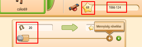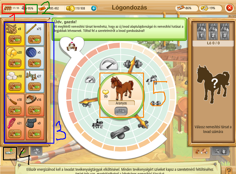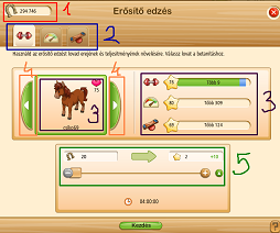 Amikor a csúszkát (zöld 5) húzzátok jobbra,akkor a betanítási sávban (fekete 3) elindul egy kék (intenzív esetén sárga) feltöltő csík.Ez mutatja,hogy a kiválasztott patkómennyiségért hány betanítási pontra lesztek még a következő betanítási szinttől (csillag)