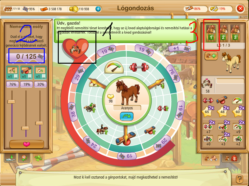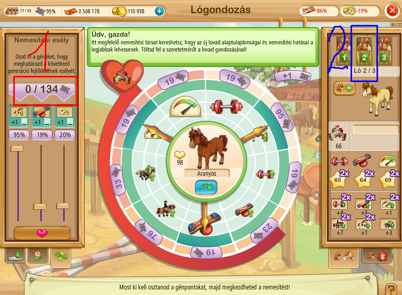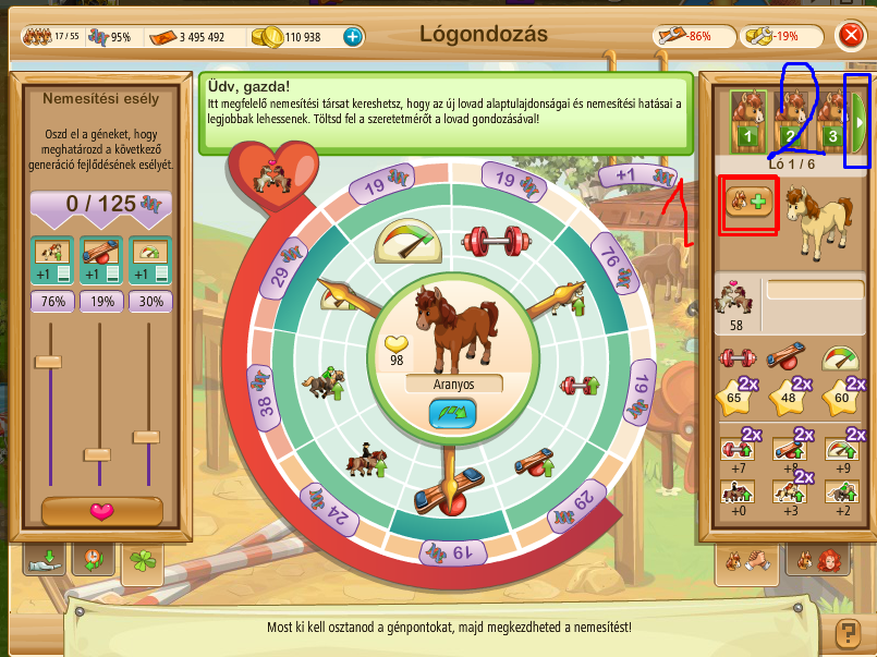 Ha kiválasztottuk a lovak közül azt,amelyik a legtöbb génpontot adja,akkor el kell osztani a pontokat az ikonok között.