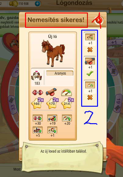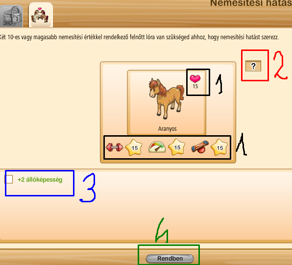Kék 3: Ide rakja a felkínált nemesítési hatásokat,amikből választhatsz a lovadnak.(ebben az esetben 1 et kínált fel és 1 et választhatsz).Ha kiválasztottad ami kell,akkor rakj a kis négyzetbe pipát.Ha megvan,akkor az alsó gomb aktívvá válik.