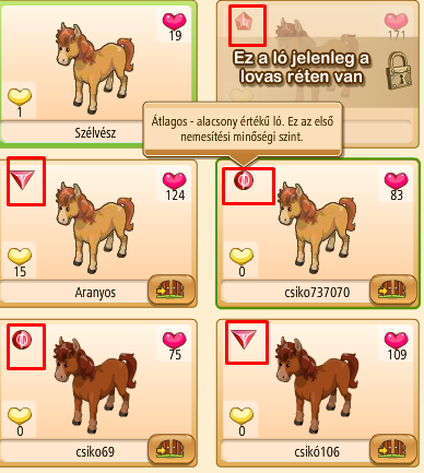 Nemesítésnél mindig a 2 bal oldalon lévő ló (szülők) nemesítési hatásait teszi kiválaszthatóvá a játék.Ezeket úgymond örökli a kiscsikó.De mindig ad + 1 új nemesítési hatást is.Ezekből lehet ugye X db-ot választani.Az,hogy a + 1 új nemesítési hatás milyen "erős",az attól függ,hogy a lovunknak milyen a minőségi szintje (bubija).Ebből 6 féle van.Minél nagyobb értékű ez a "bubi",annál jobb nemesítési hatást kínál fel a játék.Kép:a pirossal bekeretezett ikon jelzi,hogy az adott lónak hanyas szintű bubija van.Ha ráviszitek a kurzort,akkor ki is írja szépen
