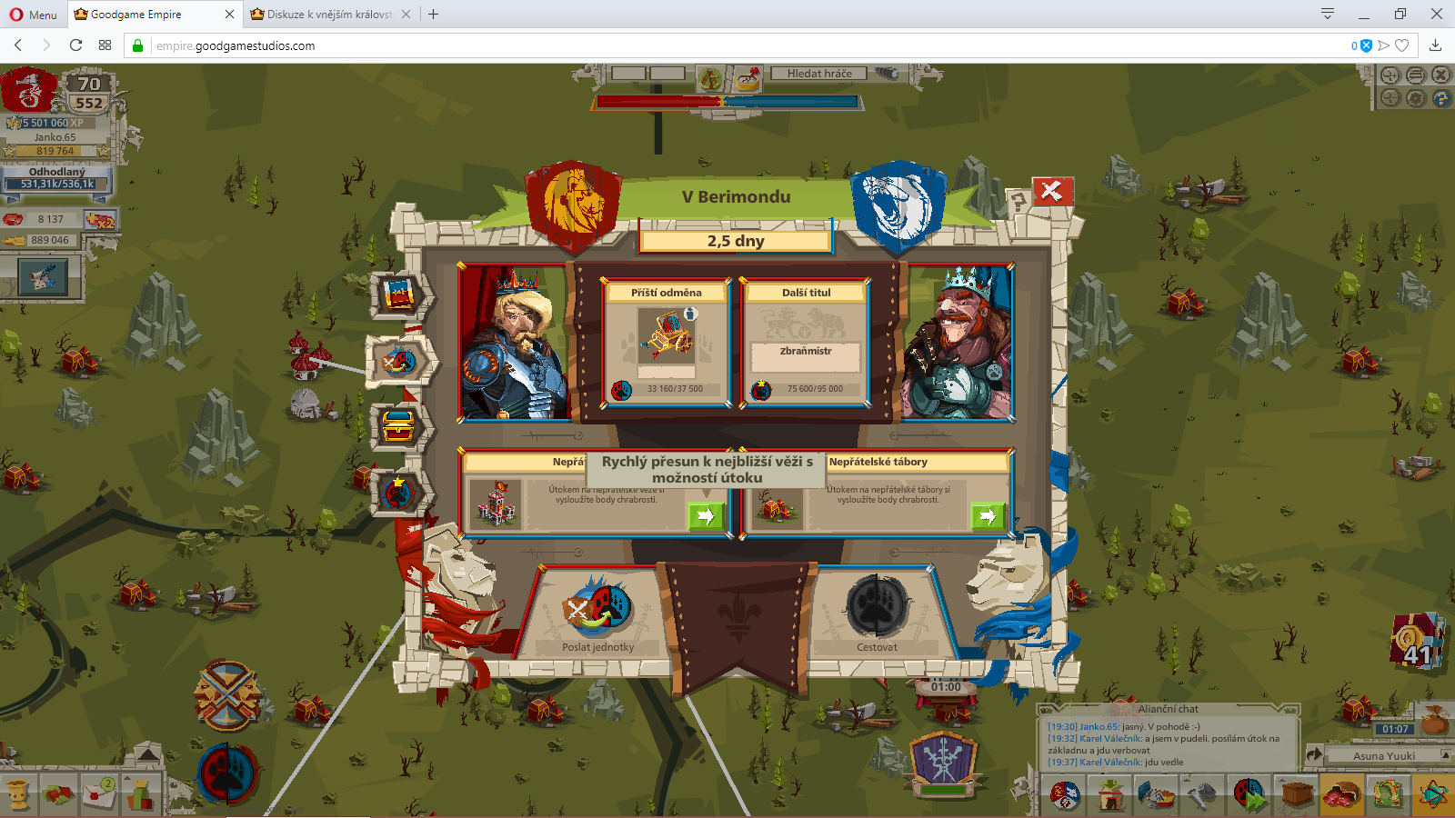 Lidi může mi někdo vysvětlit ten neskutečnej bordel na Beri?Když autor založí diskuzi tak ať tam taky můžou psát hráči.Na tomhle fóru je čím dál víc nepřehlednej bordel.Sem na Beri když kliknu na útok na stany protihráčů tak bez problémů.Už včera to začalo blbnout pak to šlo dnes opět ne.Na mapě musí člověk jak blb hledat strážnou věž.Jelikož zmizela ikona a plnění úkolů.Když kliknu na strážnou věž že chci jet útok je to tmaví jako když prostě nemůžu jet na cíl,a píše mi to směšnou blbinu.Nejdřív musíte porazit nepřítele ve strážných věžích.Asi z těžka když to nejde.