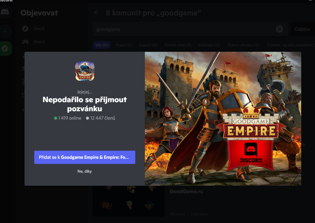 https://community.goodgamestudios.com/empire/cs/discussion/386393/pripojte-se-k-oficialnimu-discordu-spolecnosti-goodgame-jeste-dnes#latestRamirez911 (CZ1) napsal(a):Z Ničeho nic mi zmizel server gge na discordu a nelze se připojit.Proč se te stalo?