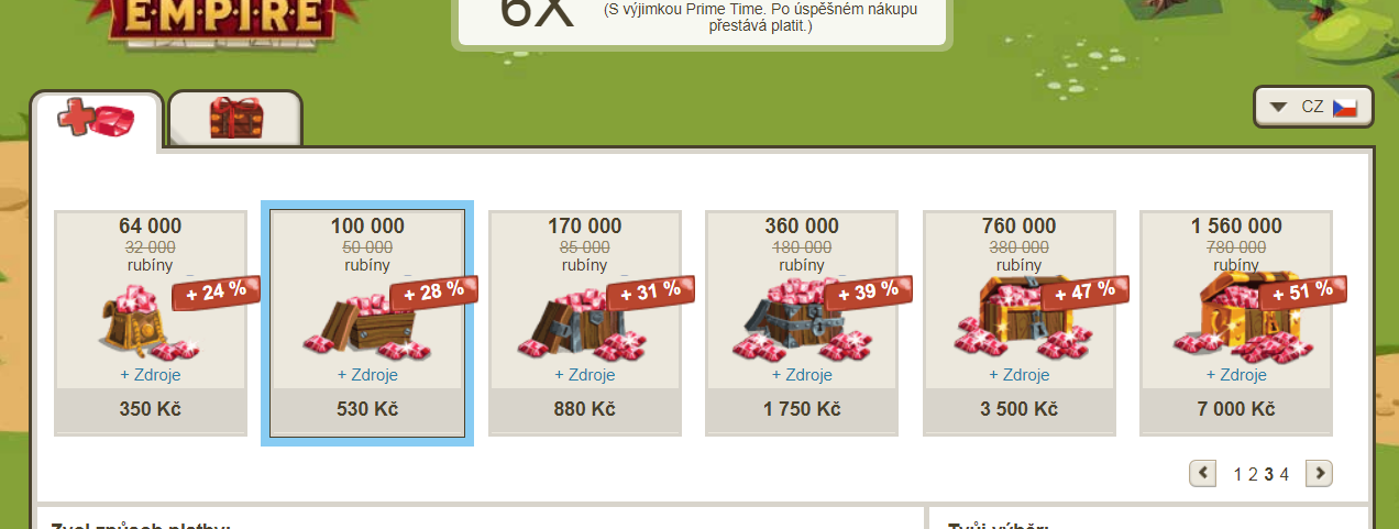 Jestli si hrac, ktery se objevuje v topu, tak o tvem nazoru popremyslim jinak to jsou jen tve spekulace.EET (CZ1) napsal(a):Já bych si koupil ten 500% ale ten kdo chce vyhrát by jistě upřednostnil ten druhý.Balík4 (CZ1) napsal(a):EET (CZ1) napsal(a):Ono je to vlastně docela logické, kdo chce být na TOPu, ten potřebuje spíše více velkých bonusů než jeden menší co by mu vydržel dlouho. Kdo se chce prostě pyšnit na prvních příčkách je asi připravený za to zaplatit a GGE se tomu přizpůsobuje tak, že kdo sice si zaplatí víc, ale zase se dostane dál.