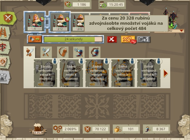 Zdvojnásobení vojáků při verbování.Je sice možné že to někdo používá ale dát 20k rubínů za 242 vojáků navíc který ještě musím naverbovat a zaplatit zlatem jako velká blbost kdyby to stálo 2k bylo by to stejně hodně možná by se nad tím mohl někdo zamyslet