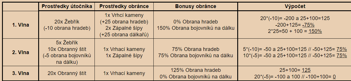 V tomto případě tedy bude bonus z prostředků v jedné vlně 95% k Obraně bojovníků na dálku a 25% k Ochraně hradeb.