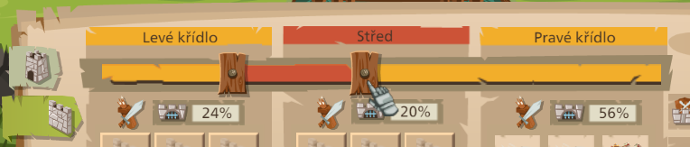 Následně je pomocí posuvníků třeba vybrat, kolik % vojáků bude bránit kterou část hradeb - ty máme 3, dvě křídla a střed.