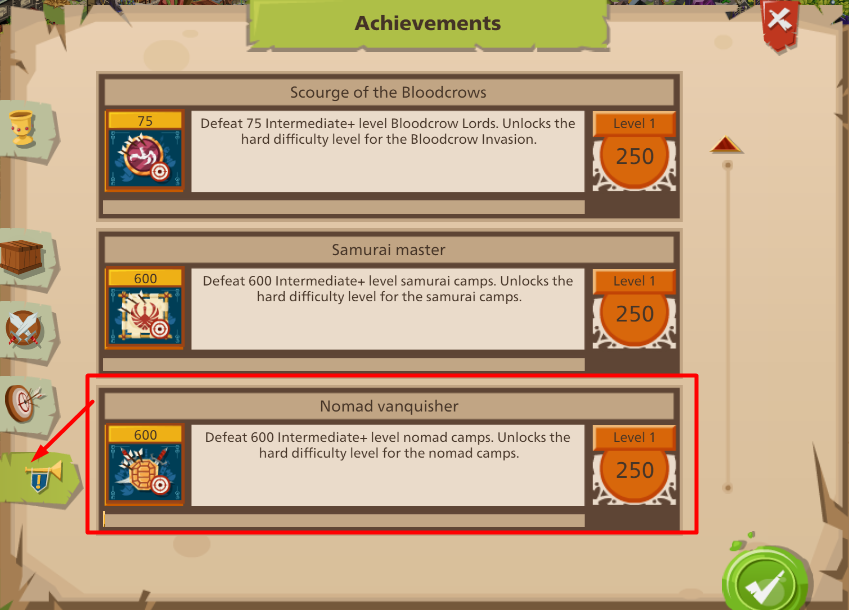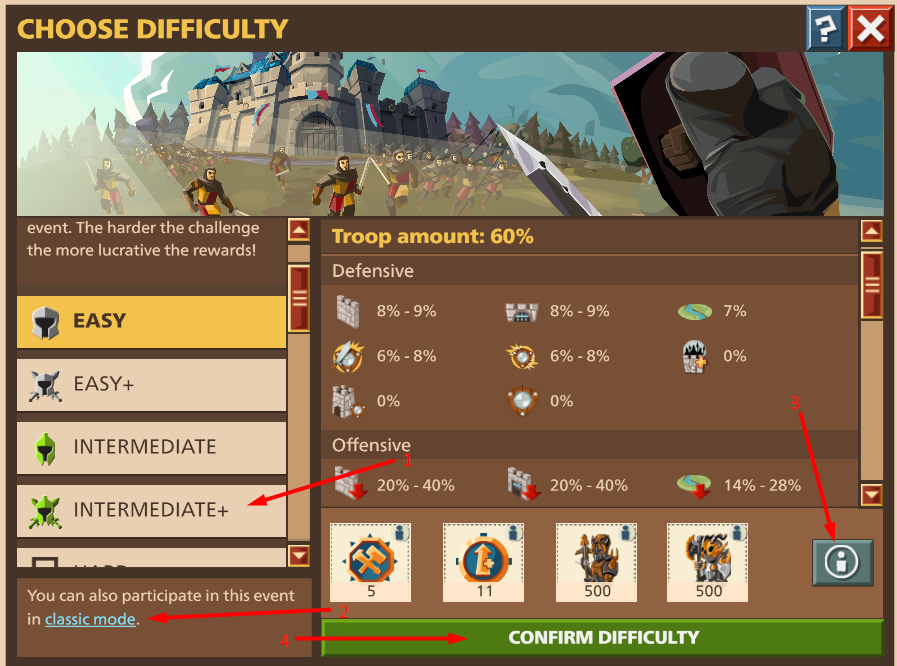 3) Zde se můžete podívat, jakou odměnu při které obtížnosti můžete získat. A také v rámečku nahoře můžete zkontrolovat, jak silné budou nomádské tábory.