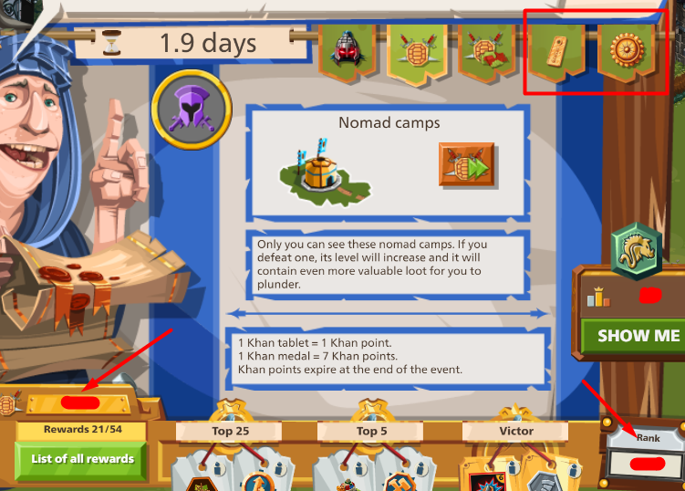 První záložka vlevo je Chánova pomsta, tato část je pouze pro legendární úrovně, takže nízké úrovně tuto záložku neuvidí. Druhá a třetí záložka se týká Nomádů. Vaše bodové score a pořadí aliance. Tyto body získáváte tím, že útočíte na tábory Nomádů/Chána a sbíráte chánovy tabulky/chánovy medaile. 1 chánská tabulka = 1 bod, 1 chánská medaile = 7 bodů.