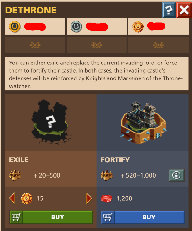 Pokud jste vyšpehovali hrad a nelíbí se vám nastavení jeho obrany, nebo množství obránců, máte několik možností. Můžete tohoto hradního pána vyhostit, nebo hrad za rubíny posílit. Tato funkce funguje pouze pro legendární úrovně, takže zpočátku budete muset porážet to co vám přijde pod ruku, ale věřím, že vám to půjde dobře