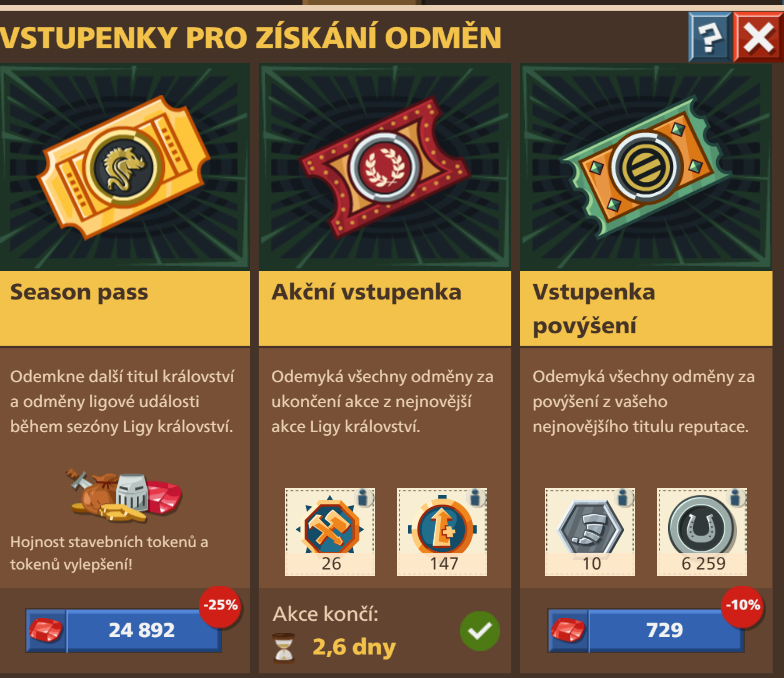 Akční pass je možno koupit vždy jen pro probíhající událost - zbývající čas můžete vidět v Průvodci ligou. Tam také můžete koupit oba passy (vždy pro probíhající událost, nebo následný titul):
