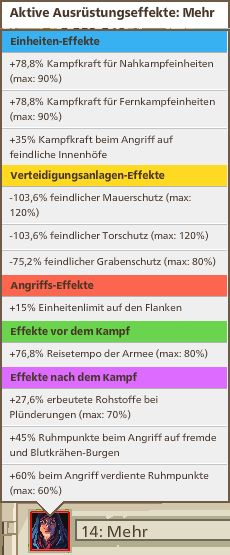 Ist das so gewollt, oder ein Versehen? Die alte Krähe hat zwar "nur" 60% Ruhm, aber immerhin dafür 125% Innenhof. Dazu hat sie 35% Flanke und 10% Mitte Bonus, also viel mehr Angreifer, als die 15% Flanke hier. Da nutzen dann auch die 105% Ruhm nichts? Irgendwie erscheint es mir als Fehlkonstruktion?