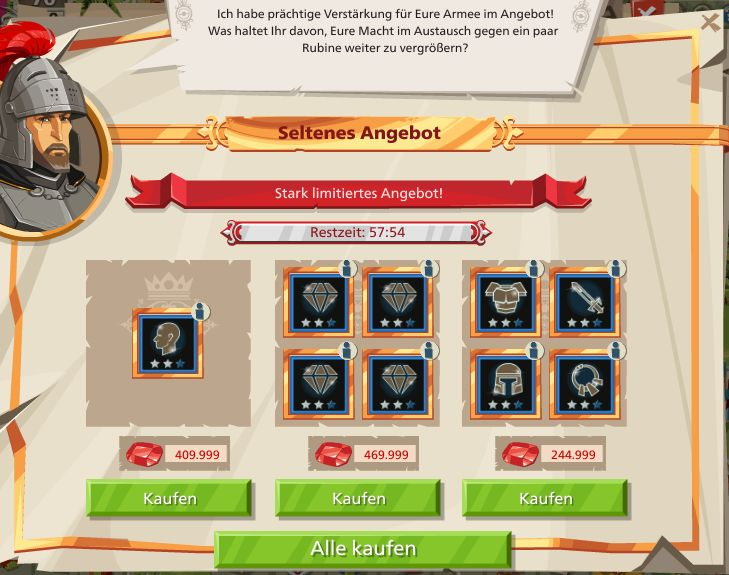Der Wegfall der Kisten und Kombiangebote ist schon ein dicker Hund aber heute kam für mich die nächste negative Erscheinung. Es ist nicht mehr möglich mit seinen Rubinen auf der Seite noch Rubi-wkz oder Banner zu kaufen (Heldenbanner, Königsbanner, Schilde ect.) nur noch bei den Angeboten.