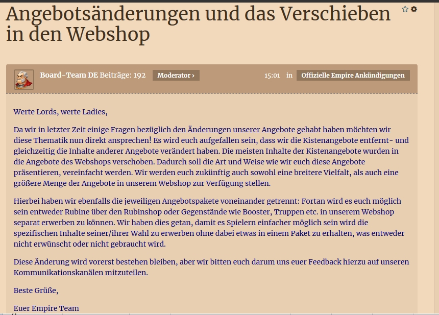 also mal analysieren:Da wir in letzter Zeit einige Fragen bezüglich den Änderungen unserer Angebote gehabt haben möchten wir diese Thematik nun direkt ansprechen! Es wird euch aufgefallen sein, dass wir die Kistenangebote entfernt- und gleichzeitig die Inhalte anderer Angebote verändert haben.in letzter zeit? welche sachen raucht ihr denn? seit die kistenangebote weg sind rennen eure kunden sturm, und euch interessierts nicht. aber wir können froh sein dass ihr von der schnellen truppe seit, sonst hätte es noch paar monate gedauert bis ihr mal was dazu sagt (ironie aus)Die meisten Inhalte der Kistenangebote wurden in die Angebote des Webshops verschoben. Dadurch soll die Art und Weise wie wir euch diese Angebote präsentieren, vereinfacht werden.dabei meint ihr: es gibt keine kistenangebote zusammen mit stufenangeboten mehr. und da dies eine glorreiche idee unsererseits war gibts auch keine primetime mehr für diese angebote und auch die rubinverdoppler die man noch hat kann man dafür nicht verwenden. wir sind der überzeugung dass ihr so spielgeil seit dass ihr jetzt das vierfache an geld für die halbe leistung zahlen wolltWir werden euch zukünftig auch sowohl eine breitere Vielfalt, als auch eine größere Menge der Angebote in unserem Webshop zur Verfügung stellen.soll heissen: kauft den dreck, solange wir euch nicht noch mehr wegnehmenHierbei haben wir ebenfalls die jeweiligen Angebotspakete voneinander getrennt: Fortan wird es euch möglich sein entweder Rubine über den Rubinshop oder Gegenstände wie Booster, Truppen etc. in unserem Webshop separat erwerben zu können. Wir haben dies getan, damit es Spielern einfacher möglich sein wird die spezifischen Inhalte seiner/ihrer Wahl zu erwerben ohne dabei etwas in einem Paket zu erhalten, was entweder nicht erwünscht oder nicht gebraucht wird.soll heissen: wir halten euch für solche vollpfosten, dass ihr uns glaubt dass wir euch nur gutes tun wollen. wenn ihr halbwegs gut spielen wollt müsst ihr banken bis es weh tut, das seit ihr uns schuldig.Diese Änderung wird vorerst bestehen bleiben, aber wir bitten euch darum uns euer Feedback hierzu auf unseren Kommunikationskanälen mitzuteilen.