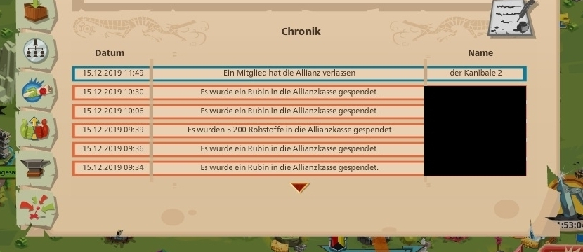 Bin "Wiedereinsteiger" (schon lange her) und seit ein paar Wochen wieder dabei. Heute gab es eine Meldung in der Allianzübersicht, von einem Alli-Mitglied, von dem ich noch nie im Chat gelesen habe (und auch wohl nicht mehr lesen werde