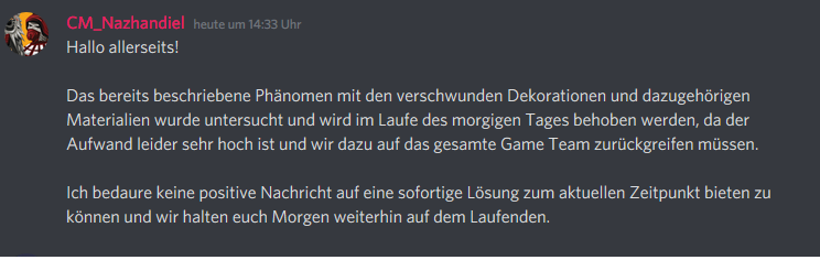 Jepp. Ist vielleicht einfacher und übersichtlicher, wenn wir uns auf einen Thread für diesen Fehler konzentrieren:ThorBerserk1 (DE1) schrieb:Verweise mal auf Thread " Alle Dekos weg - Gebäudelager.
