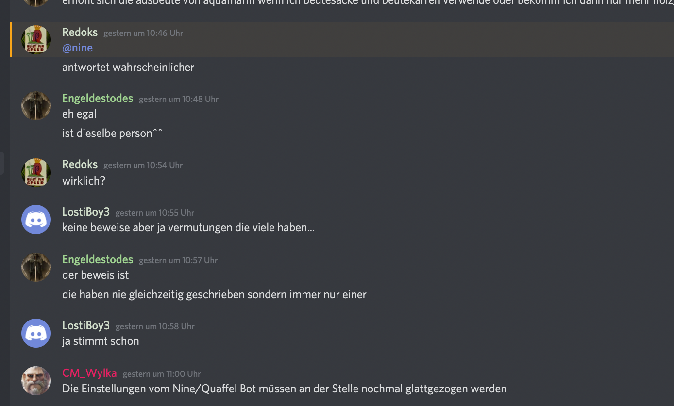 Was mir noch aufgefallen ist, dass man bei dir als Beweis sieht, dass du mit Wylka zu anderen Zeiten, wie mit Nine antwortest (unterschiedliche Arbeitszeiten?) und mir, dass ich gleichzeitig mit beiden schreibe... aber Widersprüche beleben ja auch das Geschäft...