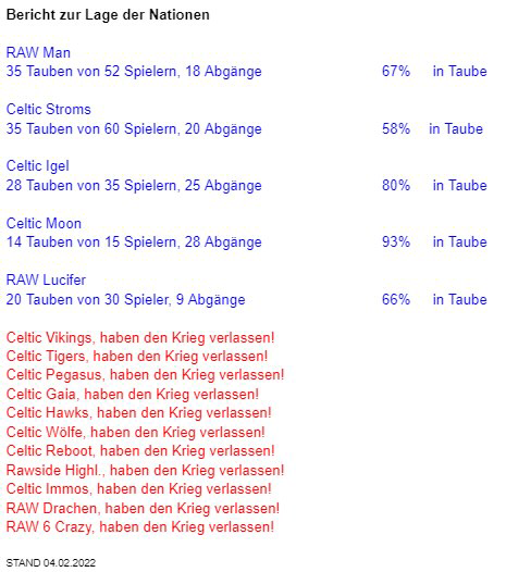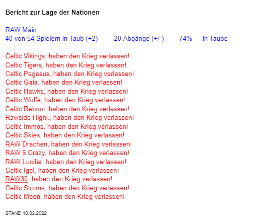 - Die Celtic Storms, das einzige was überblieb vom mächtigen Celtic Clan haben nun auch den Krieg Verlassen! Jetzt wo die 30 nach einer Woche schon in Sack gehauen hat, sieht Herr Gambler wohl keine Hoffnung mehr, tja das wars dann wohl^^