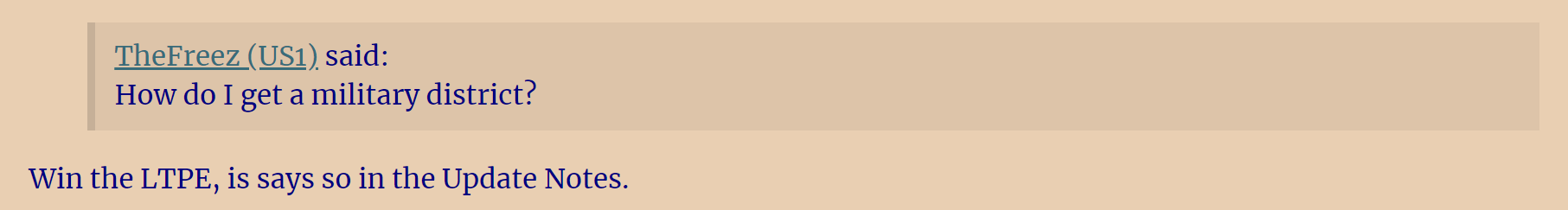 Win the LTPE, is says so in the Update Notes.TheFreez (US1) said:How do I get a military district?