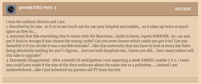 disappointed to see military district for 150000 gold coin (maybe move it to silver coins in blacksmith tent) when its a 10 X 10 building....takes up a lot of room.. from what i see and hear from others getting it...