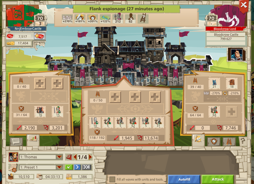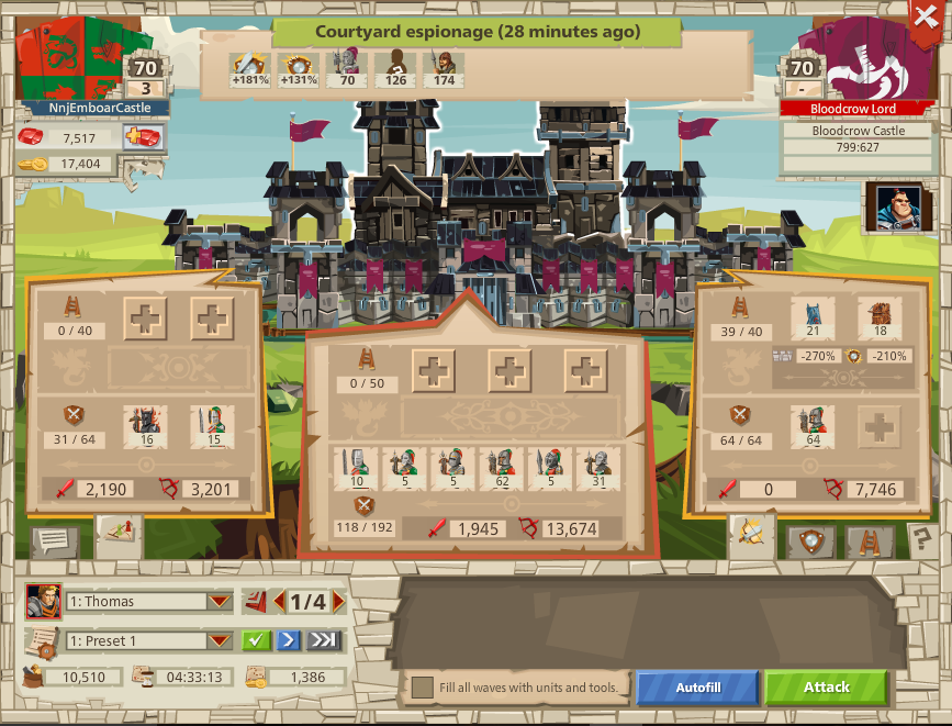 Would this attack work? To note, my commander is balanced, and I have stocked all the waves on the right flank (the others don't have defending troops, just the right flank and courtyard have any defenders) with the max number of Veteran Crossbowmen, and the back three waves I used 40 wooden mantlets each, to get the ranged defender's defense down from 201% to 1%, since I'm not wasting any more Cast Iron Mantlets. [4871632]
