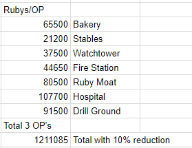 So if all glory memorial levels were built with 10% and ruby moat level 2 with 50% we come down to a difference of