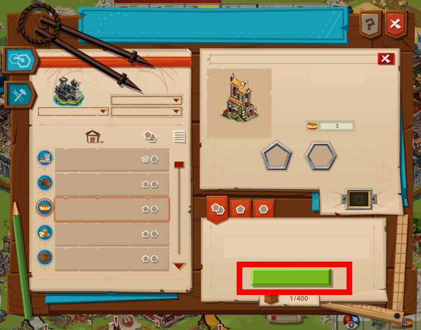 (Could be pentagonal as well, depends on the type of the item as said above. Pentagonal items enhance the ability of the buildings e.g. to produce or store more items such as wood etc. Hexagonal items enhance the look of the buildings, and make them work like decorations)If you plan on making a new item (Pentagonal only) you should click on the green "Construction" button.
