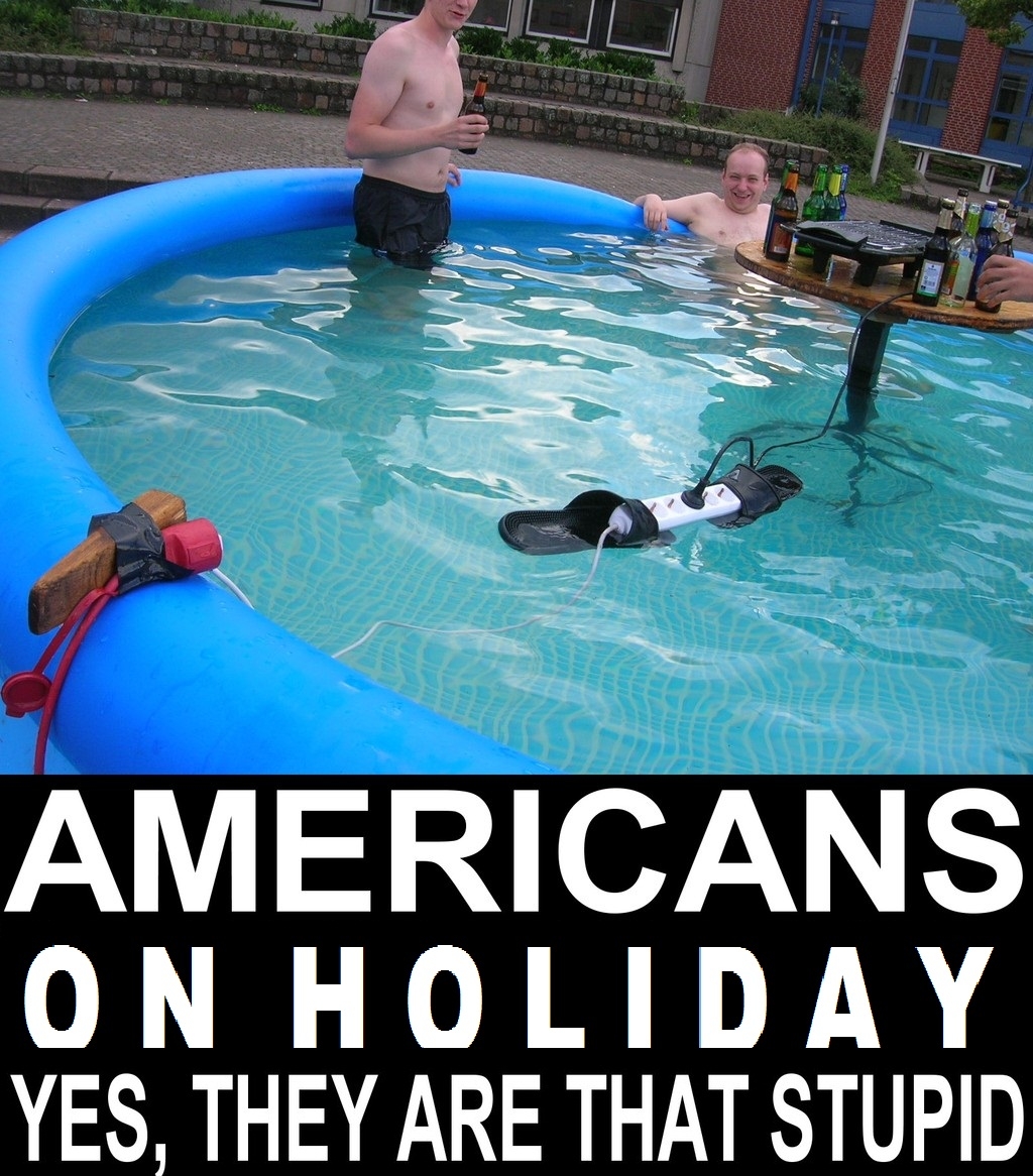 Adjust your TREY tables and Fasten your seat belts. Make sure you TREY tables are in the full up right and locked position... We just had another person approach the hook and take the bait... Come on. You people are way too up tight. Learn to take a joke. Besides, the image could be referencing the fact that these particular Americans are that stupid. And, in fact, doesn't feature any Americans at all... Besides the fact that I know plenty of Americans who have laughed at this picture. Besides, I might even be American myself. Nice to meet you @Gohan139 (US1). You have just walked into and been captured in a MASTER TROLL LVL OVER 9000's layer. What do you do?Gohan139 (US1) said:wow, says the a**hole assuming all Americans are stupid. Seriously? You whine about being disrespected, then you go off and seemingly give the entire US the finger by acting like we all have pools with outlets in them. Get the hell out of here, moron.YourBloodyBase (US1) said:The Projection Here is strong with this one.....Michelle Lynne (US1) said:and again I am out . . . you don't need my help or anyone elses making yourself look like a fool. how old are you 10?
