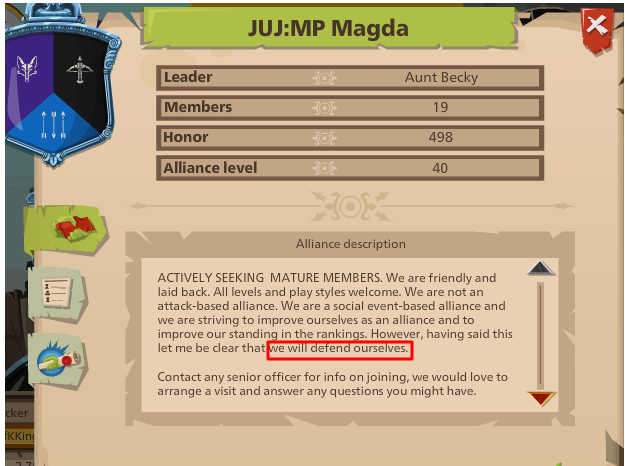 I am the new leader of the alliance JUJ:MP Magda. We are looking for mature, active players who want to learn and grow in the game. We are a friendly diverse group who are looking to increase our membership and build our reputation while improving our standing in the rankings. We have strong players and our alliance has a solid history of success, we would love to have new members interested in growing with an alliance while also sharing your skills and talents.