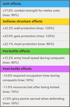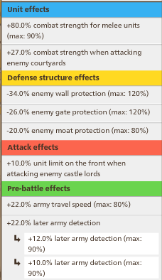 Third, you did add the +17% melee defense bonus, but you forgot to take into account the -30% courtyard defense due to the broken wall. Anyway, in your calculations you did not use the total defense strength, so this is a harmless mistake. [Edit: should be -30% for the attacker, not the defender, but that won't make a difference for the ratios either, so still harmless.]