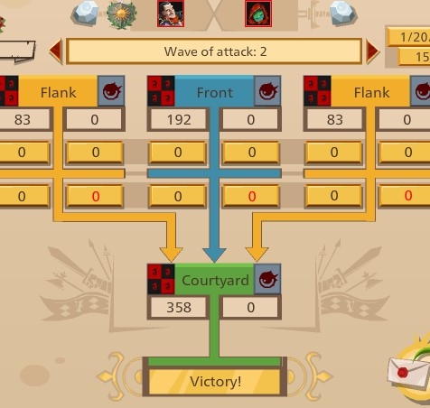 Finally, I tried your method on lvl90 Samurai camp, and it doesn't look like the number of losses on the flank is lower than what I usually get. It just might be that my sample size is too small, but could you please tell me what your usual lineup against Samurai camp is? FYI, I use mostly Imperial Marksmen for range and Imperial Knight for melee on the first waves since they are rather cheap and easy to recruit more of.