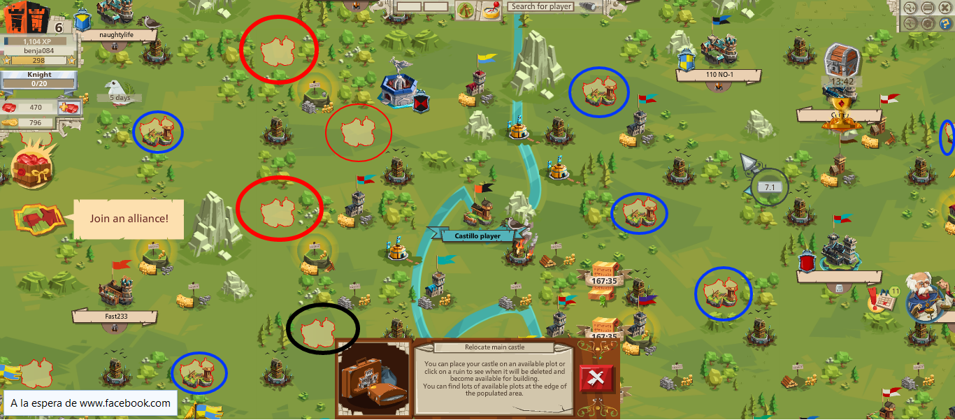 So I'll level up fast to show you the next step: Choose a place. There isn't always a free place to move exactly where you want it, specially within what I like to call "The metropolitan area" of the game, that's the first zone summoned by the game and it's surroundings, it's generally where the #1 players are, but it's harsh to new players who don't have a good alliance, so I don't recommend moving there without first thinking about it good.