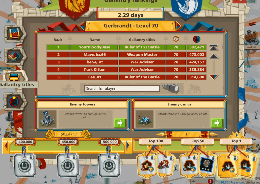 Right now you might not even notice. But, if you make it to the capital you go right past it and continue hitting towers I am pretty sure. A lot of people bother doing it. Mainly because the rewards to them are kind of useless. I am in the first place right now on the Red Side at Level 70 and don't intend on going any father in the event after I've collected the silver coins. And, if I hold on to the ruler of battle title for a few days it helps me loot more coins and resources for tools in my castle. Most of the giant players don't need the gold or silver or subpar widgets and decos.ImperialGuard (US1) said:But now noone even join it will be much more fun if they extended the play time of the event.In the current version you need at least 7 days to conquer the enemy's capital so players would still have time to get the individual rewards...
