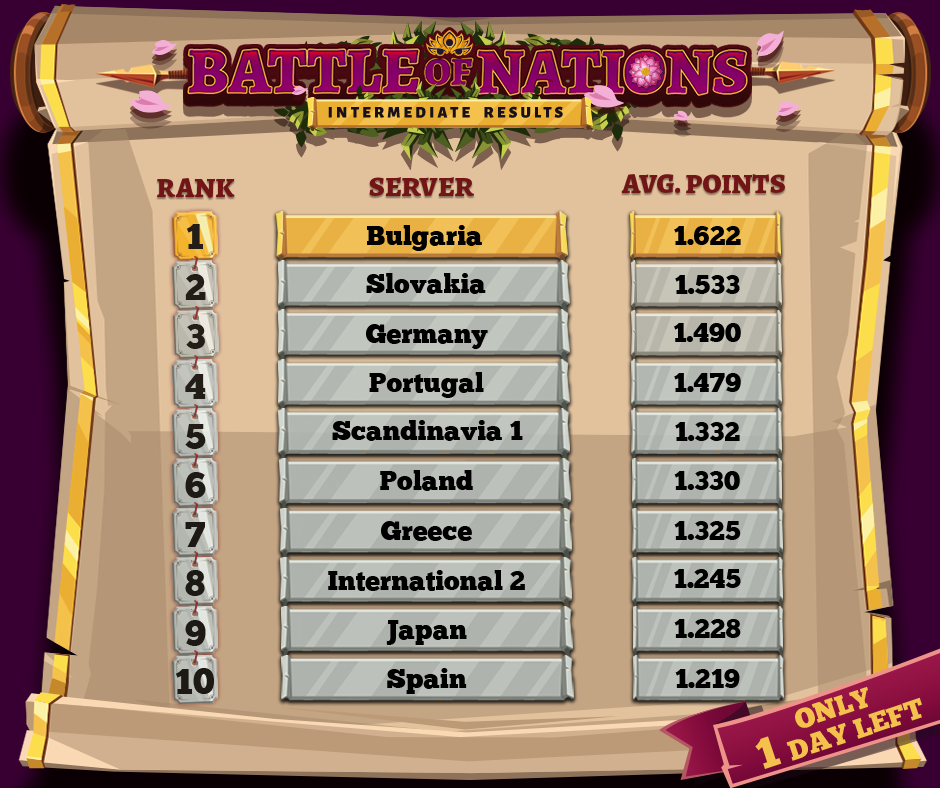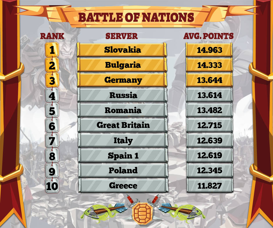 Here's the Ranking overview of how the different servers are performing in the Battle Of Nations event. Our congratulations to the warriors from Bulgaria that are currently leading the Battle of Nations!