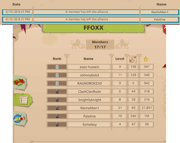 I pointed this out to the Leader, told them i wasn't really sure what they expected (and maybe to just build more guardhouses). Since we were at war, apparently actively on their part, when it came to daily spy and sabo quest, they would take priority over neutral targets. The guy wasn't trying to hear any of that, and they just threatened to get a stronger player to retaliate on their behalf at me even though I...wasn't involved lol. So, sure enough some lvl 70-800 is breathing down my neck. "Leave little players alone", "Why're you trying to get them to quit", ect. Similarly, this guy wasn't trying to hear anything I was saying, convinced his friend was in the right. I was annoyed I'd gotten dragged into this, so I did send out a MM telling everyone to ceasefire, at least until some kind of diplomacy was reached.