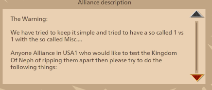 In any case, Its Organic was a great leader, though if you look back through the Forums from posts earlier in the war your side threw as many insults at him as you do now to Serry. So it's interesting that you're now praising him as the reason for KoN's power. Nonetheless, it was Serry who grew the alliance into the powerhouse the server knows. But you're welcome to your opinion.VeeWeeZY (US1) said:LOL so now KON is interested in having a one v one. Now that they don't have numbers on their side they want a fair fight? Lol Serry take your medicine and calm down. No one cares you're back. Lets be real about the whole situation. The reason KON was a great alliance wasn't due to you but Organic. The slow downslide started when you became leader.