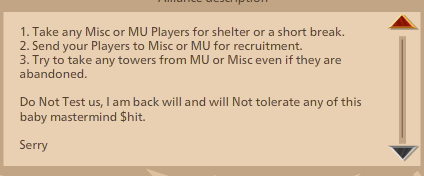 LOL so now KON is interested in having a one v one. Now that they dont have numbers on their side they want a fair fight? Lol Serry take your medicine and calm down. No one cares your back. Lets be real about the whole situation. The reason KON was a great alliance wasnt due to you but Organic. The slow downslide started when you became leader.
