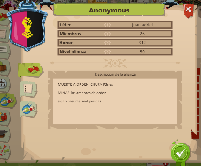 Hola a todos , ayer dia 19 de junio recibo un mensaje por wasap del lider de una alianza del servdidor España 2 y este lider me muestra una foto de un mensaje que supuestamente yo a nombre de Valeixe mi cuenta en España 2 le habia mandado a el jabají Rojo donde se aprecia y se puede leer insultos muy graves a travez de este juego , y este jugador El Jabají Rojo me acusa ademas de denunciarme y vanearme soporte anteriormente por 6 horas de vaneo en mi cuenta ayer , me salta este jugador por asi llamarle intimidandome y amenazandome de que me denunciaria de nuevo , al rato veo que su lider me manda dicha foto por wasap y efectivamente ya se lo habia propuesto, unicamente que habia dos errores uno de ellos que ese mensaje es falso ya que lo ha creado desde otro servidor con una cuenta que el abrio a mi nombre y fue tan listo que en lugar de poner "Valeixe" puso el listo e inteligente VALIEXE , encima con mayusculas para que se viese bien , esto es el atropello que este jugador y algunos mas de su familia estan haciendo e intentan colar cuando ven que en el juego no son capaces de hacer nada contra el rival deportivamente , estos son los que van dando lecciones de modales , de jugar y demas , invadiendo el mapa de cuentas nuevas para que ningun jugador tenga la opcion de cambiar de lugar en caso que lo decida por algun motivo o algun nuevo jugador que decida entrar a este servidor y pueda recuperar algun fortin de alguien que hubiese dejado de jugar no pudiese tener espacios libres al lado de dichos fortines por ejemplo , esto por parte de los que van dandose de buenos jugadores y buenos modales , un tipo que hasta se insulta solo y por aqui no pongo la captura porque Balder al que tambien menciona en uno de sus mensajes que yo tengo en mi buzon lo pone por medio , pero si alguien esta interesado en ver el mensaje o los mensajes ,eso si LEGALES no con TRAMPA , como los que hace este mal jugador y de mal perder , no dudeis y me lo haceis saber os mando los mensajes vereis una artimaña mas que los malos jugadores hacen o intentan para hacer su justicia en el juego ya que de otra manera o forma no tienen lo que hay que tener , un cordial saludo a todos !!!