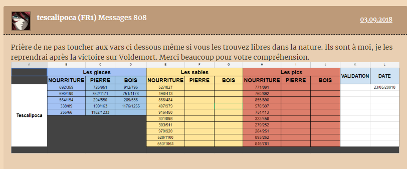 Bonjoir,tescalipoca (FR1) a dit :Pour avoir perdu moi même plusieurs fois "tous mes vars" contre Amid qui ne savait finalement que les voler, je sais par expérience qu'il est impossible de garder les rcs surtout quand ils s'accompagnent de PE à l'infini ou d'attaques en tout genre. On se lève le matin et la messagerie affiche 99 messages et les derniers ont forcément écrasés les rcs dont tu parles.