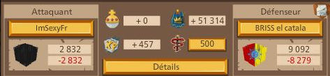 Je me dois de saluer ce propos héroïque et honorable (quoique suicidaire?). En effet, il n'est pas question ici de continuer la guerre, mais plutôt de la terminer, et de repartir chacun de son côté, avec nos pertes respectives. On notera tout de même, que tout ceci aurait pu être éviter si votre réaction (Briss notamment) avait été raisonnée, en m'envoyant par exemple plusieurs attaques sur différentes positions. Je n'aurai pas râléBRISS el catala (FR1) a dit :on cramera , on crèvera , on arrêtera , non sans se défendre ! car NOUS , nous avons de l'honneur ! mot que vous devriez prendre en considération pour que le jeu reste un plaisir , tu feras quoi quand tu seras avec 50 alliances ? les gros sont rien sans les petits ! car pas assez de burnes pour piquer des vars a un plus gros que toi ? normal en même temps c'est humain ça ! faire le cake a piller les plus petits c'est plus simple !