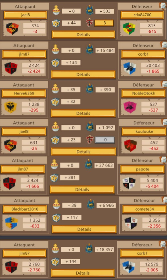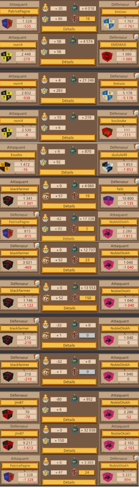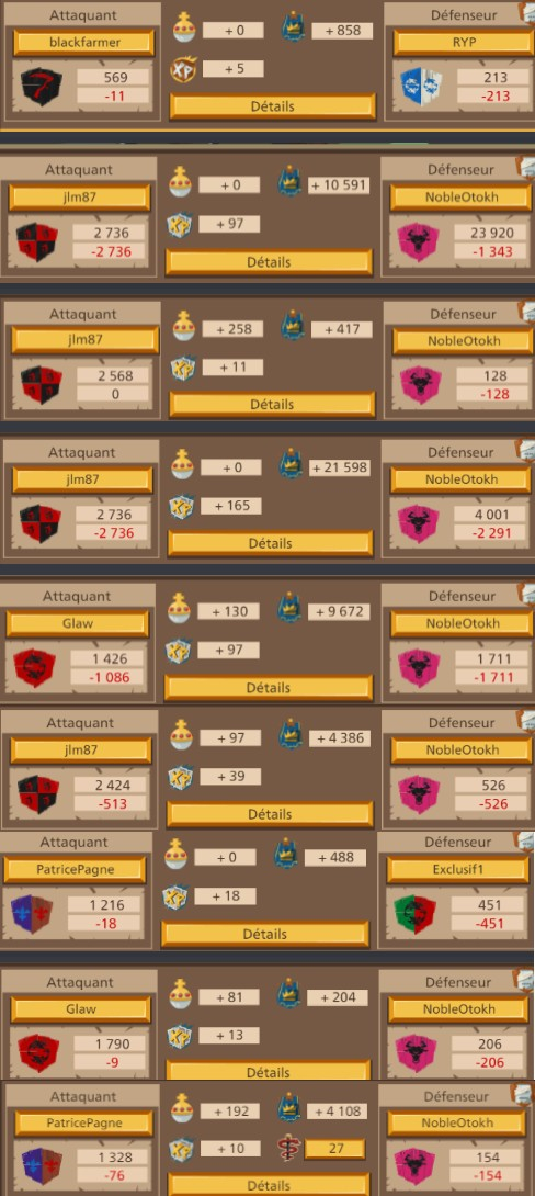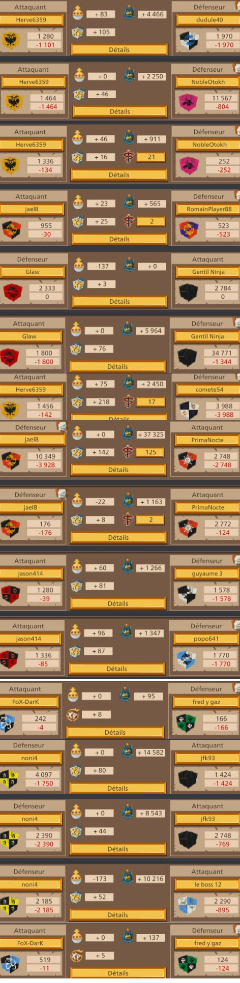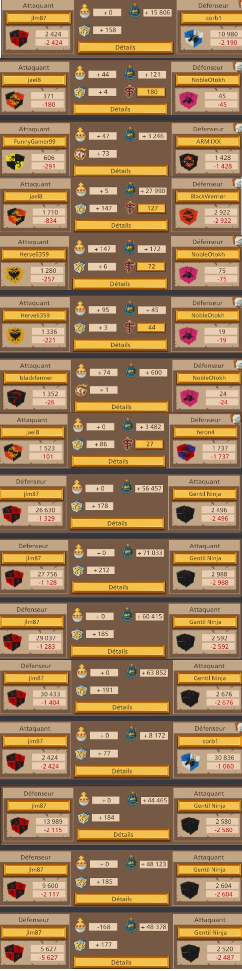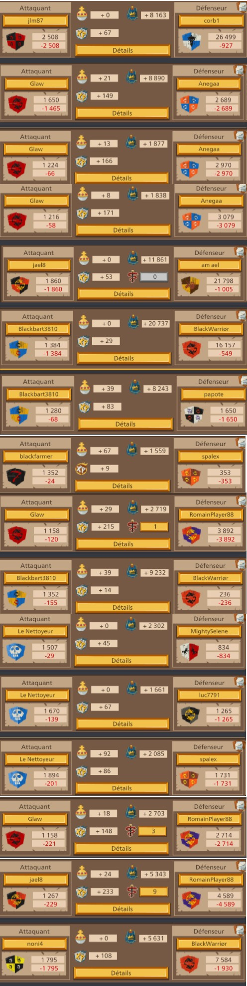 Pas de problème !jael8 (FR1) a dit :Merci à toi, non l'objectif n'est pas de détruire leur alliance je n'est pas la prétention de dire que nous le pouvons. C'est une belle guerre pour le moment il on fait appel a leur protecteur alors que NobleOtokh disait hier qu'ils avaient l'avantage et qu'il valait mieux regler sa en 1v1 pour épargner notre alliance. J'ai l'impression que son discours a changer si ils ont fait appel a leur protecteurfortané (FR1) a dit :Bonjour,jael8 (FR1) a dit :déjà 6 départ de leur coté il était 38 au début de la guerre les voilà plus que 32