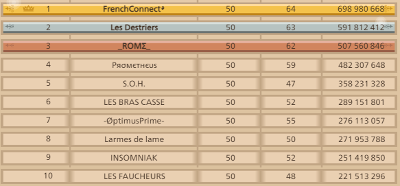 C'est pas pour ces raisons que les personnes de w1 sont mal vues.Best Imperator (WORLD1) a dit :Et puis vous méprisez le monde1, mais il n'y a pas tellement de différence en puissance entre la première alliance des deux serveurs :Pourtant le FR1 est un serveur plus ancien...------------------------Certains ne savent faire que ça on dirait... (capture d'écran authentique provenant du FR1, même si on a l'impression que ce n'est pas une image car le fond est de la même couleur que sur le jeu)