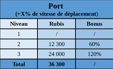 LIERRE (INT3) a dit :12 000 rubis le niveau 2 du port (l'écurie des îles ), les doigts dans le nez en mode Joueur qui n'achète pas ses rubis avec de l'argent.Vamo (FR1) a dit :bonjour