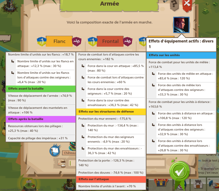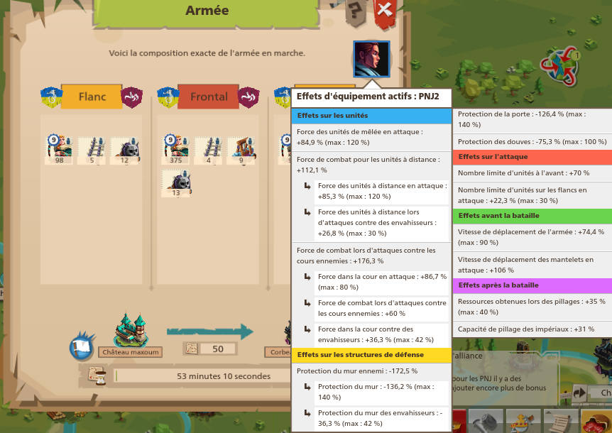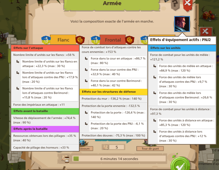 Par exemple voici un com beri envoyé sur une tour de guet, on a bien les bonus pnj liés aux gemmes que j'ai appliqué sur les pièces d'armure