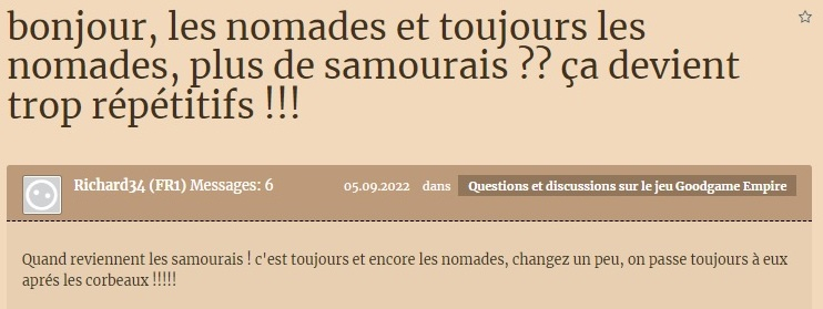 Eron le Cochon (FR1) a dit :Les samouraïs étaient l'événement qui semblait le moins buggé mais les daimyos 4 ont quand même seulement 50 soldats. Personnellement j'ai fait une centaine d'attaques sur les daimyos 4, je suis très content de l'affaire !