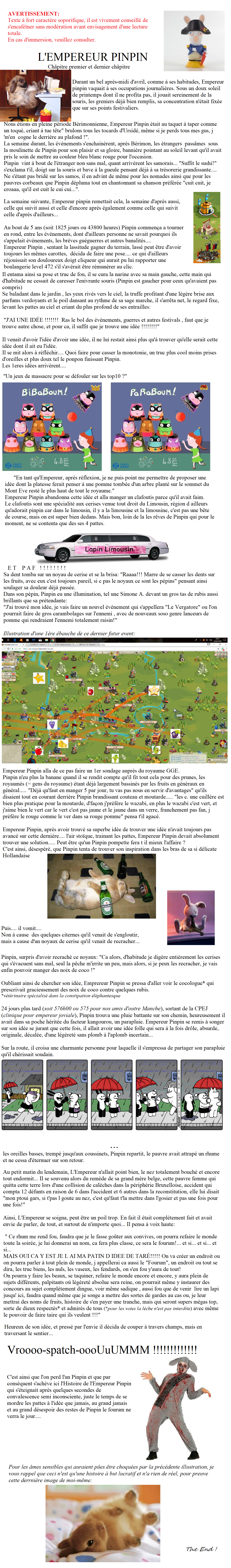 VOTRE ATTENTION S.V.P. CE QUI VA SUIVRE EST UNE FICTION TOUTE RESSEMBLANCE AVEC DES FAITS (OU DES FEES) OU PERSONNES REELLES N'EST QUE FORTUITE ET PURE COÏNCIDENCE ET L'AUTEUR SANS DOUTES PAS VRAIMENT A LA HAUTEUR S'EN EXCUSE.