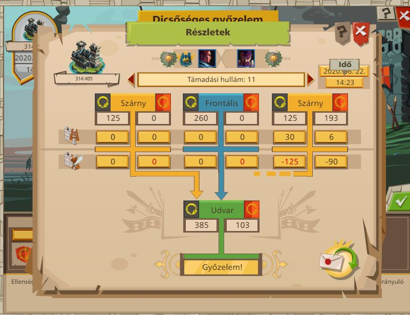 Azért azt gondolom, hogy 11 hullámmal a nagyok nem 400 alattiakat fognak támadni, mert nem érné meg megvenni azt a 11 hullámot..... Egyébként ha magukhoz valót támadnak, az is fogható védelemre pontozott csarnokkal, 900 veterán lángvetővel, 5 oltatlan mészporral a falon. Ilyenkor egy lángvetősnek 470 harci ereje van. Semmi nem szedi le a falról. Tudom, mert 9 hullámmal jöttek már, és 2-300 bukó volt a falon.