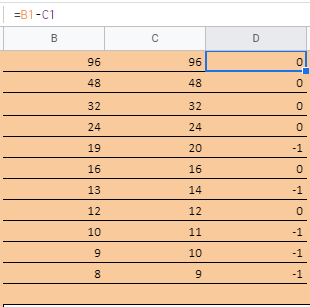 Dopo di ché nella seconda colonna [B] viene arrotondato il risultato della colonna [A] per eccesso, e nella terza [C] per difetto.