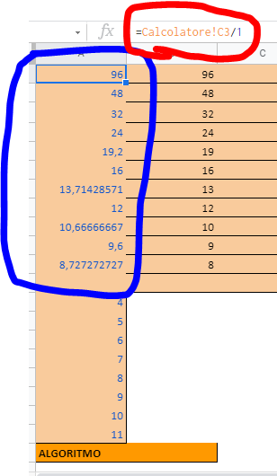 Nella prima colonna [A] viene preso la quantità totale di scudi presenti nell'attacco, e viene diviso in ogni riga da un numero diverso che parte da 1 fino a 11 (quindi il numero di ondate esistenti nel gioco).