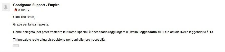 Qualche giorno fa ho segnalato il problema dell'impossibilità di spostare risorse speciali, carbone, olio e vetro, dai regni al verde. Dissi che la risposta al ticket era che bisognava essere Livello leggendario 70. Aggiunsi che era evidente lo scopo di costringere i players ad acquistare rubini per mandare avanti le costruzioni, che dopo il livello 70+1 richiedono comunque risorse speciali: se non le puoi spostare, le acquisti dal mercante spendendo rubini (tanti). Sono stato tacciato di trollaggio, infamità, calunnia, diffamazione e bannato dal forum. Ho riproposto il reclamo al servizio tecnico, ed ecco la risposta del ticket, che ora piazzo tramite un altro account creato oggi ad hoc. Come avevo detto io, occorre essere Livello Leggendario 70. Se il moderatore fosse una persona seria, mi farebbe le sue scuse, ma so già che non succederà. Bannate anche questo account, ora, fatemi vedere quanto siete uomini. Aggiungo solo una parola: VERGOGNA.