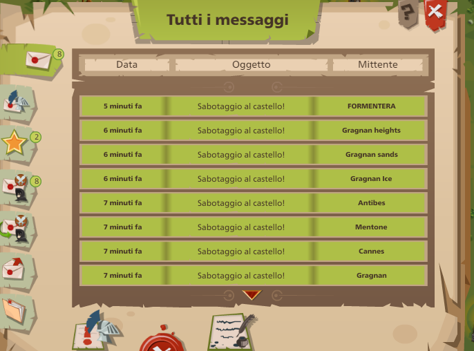 ambo le coa ne posseggono quindi , senza far nomi, posso solo dire che la soluzione a questo problema risiede nella proposta iniziale , piu semplice da fare per la GGE e facile da intuire x ogni giocatore, ovvero : 1 sabotaggio possibile e disponibile per ogni utente, che puo destinare a chi vuole , senza distinzione di castello/ mondo o avamposto ( permane il limite liv < 20 attuale , da e verso liv 70 + ) .
